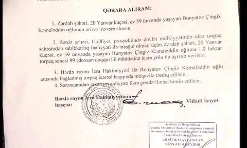Bu haqda əldə etdiyimiz bilgilərə görə, Bərdə rayon İcra Hakimiyyəti tərəfindən möhürlü-ştamplı imza atılıb, ərazi İsayevin qaynına bağışlanıb. Görünür, şəhidlərə ehtiram üçün nəzərdə tutulan abidənin yerində çayxana, ya da ticarət obyekti tikmək planı olub. Siz şəhidlərə münasibətdə təhqiramiz mövqeyə, özündənrazılığa baxın!