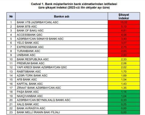 Ən çox şikayət edilən bankların TOP-10 da 3.80 indeksi ilə "Bank of Baku", 2.82 indeksi ilə "Bank BTB", 2.62 indeksi ilə “AccessBank” 2.56 indeksi ilə “Yapı Kredi Bank Azərbaycan” 2.46 indeksi ile TuranBank yer alib.